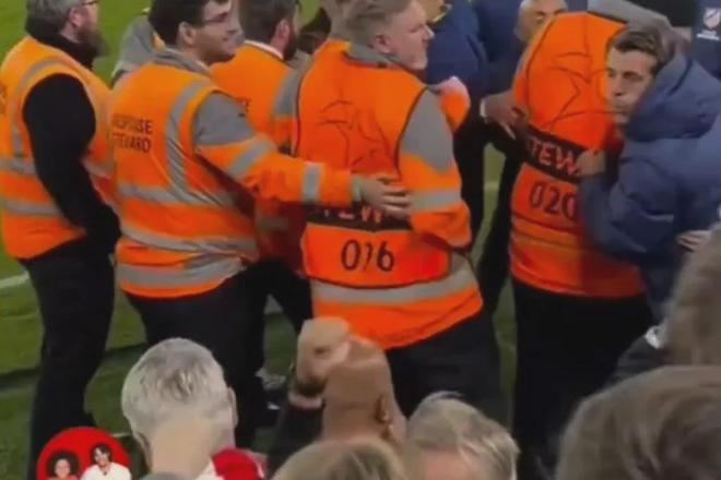 本场比赛,马竞主帅西蒙尼也卷入冲突,他与主看台的一名球迷发生争执,原因是他声称整场比赛都在遭受对方的持续辱骂,情绪激动下做出了回应举动。而来自主看台下层的一名利物浦球迷拍摄并发布的视频清晰记录下一名马竞工作人员在冲突现场附近,似乎朝着距离事件最近的一群利物浦球迷做出了吐口水的动作。